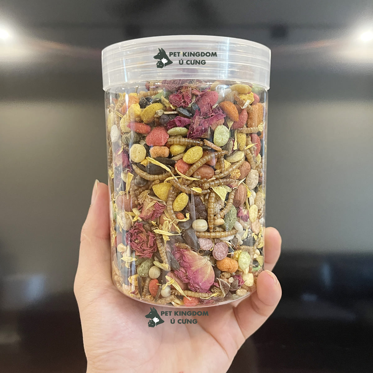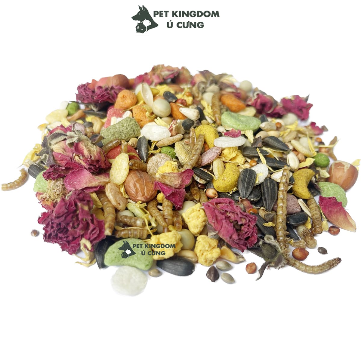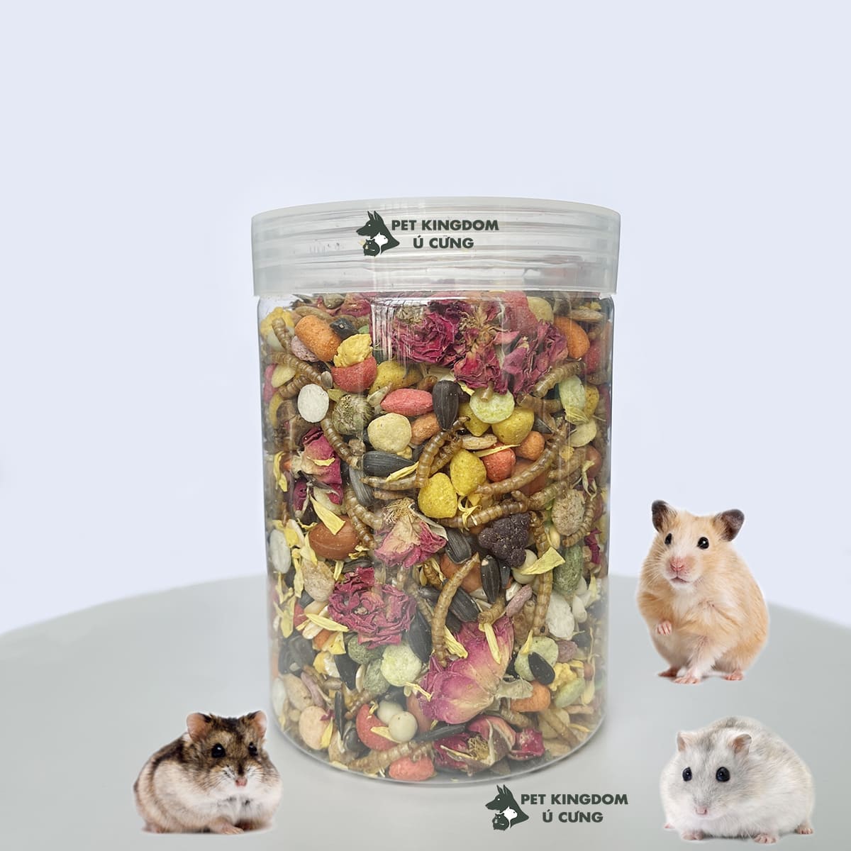Thức ăn hamster hỗn hợp ngoài các hạt cơ bản còn thêm: hoa hồng, kaytee, , yến sữa, sâu, , hoa cúc, đậu hà lan, hạt cao lương, lá khan ba khía…
